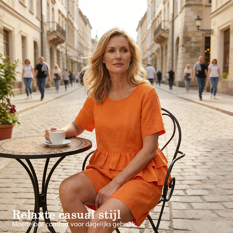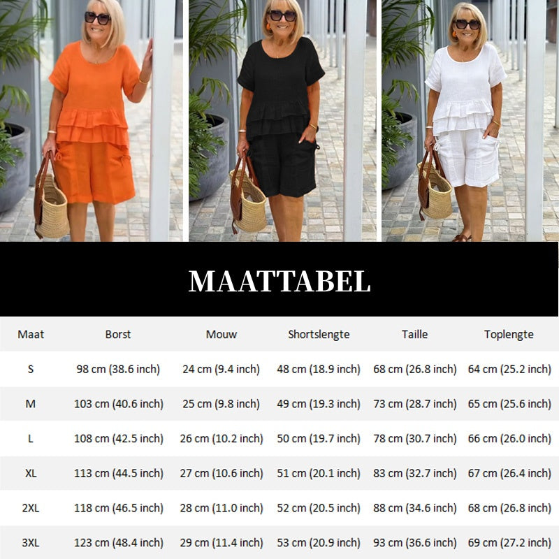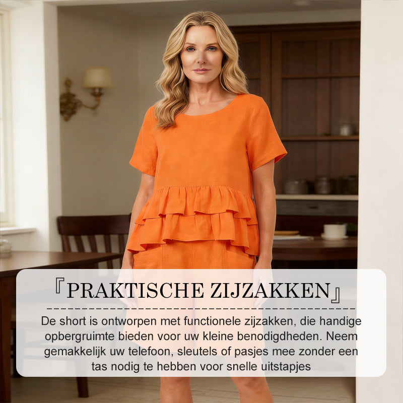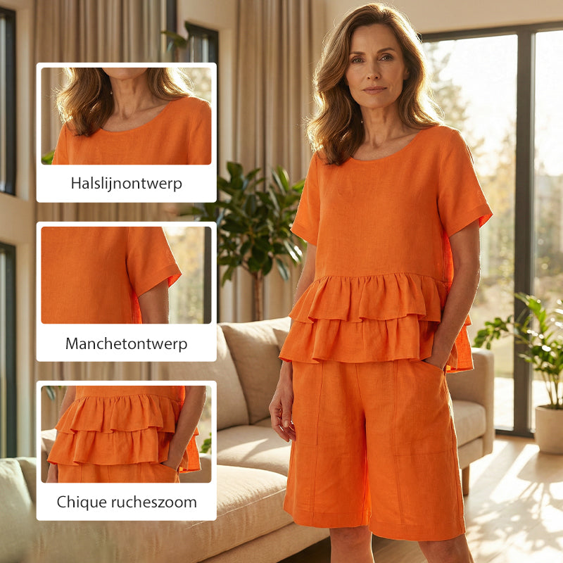 ELEGANT VOLANGKANT – Toppen har en stilren, lager på lager-volangkant som ger en modern femininitet och lekfull charm. Denna eleganta detalj lyfter den enkla designen och gör setet modernt och unikt.