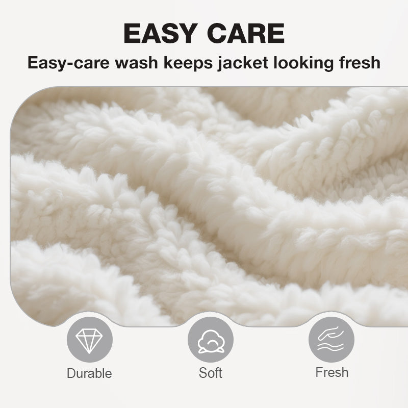 MJUKT FODER – Denna jacka är fodrad med mjukt sherpa-imitat som känns mjukt mot huden och ger behaglig värme. Den är bekväm att ha på sig under kyliga dagar utan att vara otymplig, så att du kan känna dig bekväm hela dagen lång. Insidan har en inbjudande känsla som kombinerar värme med en avslappnad, vardaglig stil.