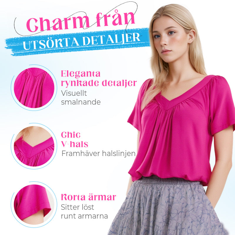 Öka kvantitet för ✨2026 Het Utförsäljning - 50% Rabatt✨ Dam Topp med Rynkade Detaljer, V-hals och Korta Ärmar