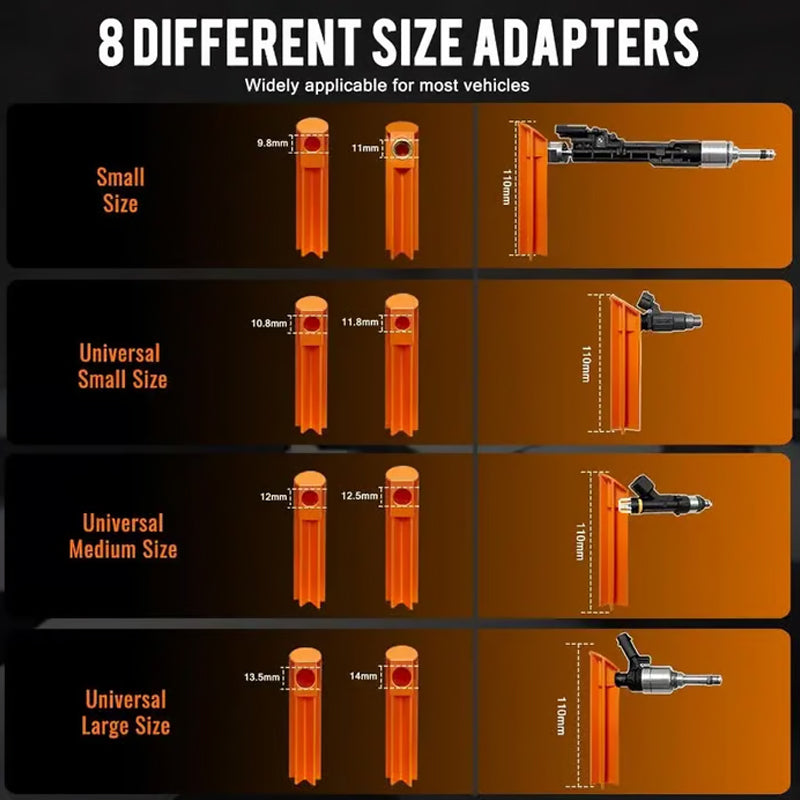 ENKEL INDIVIDUELL TESTNING – Isolera snabbt problematiska insprutare genom att testa dem en efter en. Denna enkla process hjälper dig att hitta fel som läckor eller blockeringar, vilket sparar värdefull tid och ansträngning i ditt diagnostiska arbete utan komplexa procedurer.