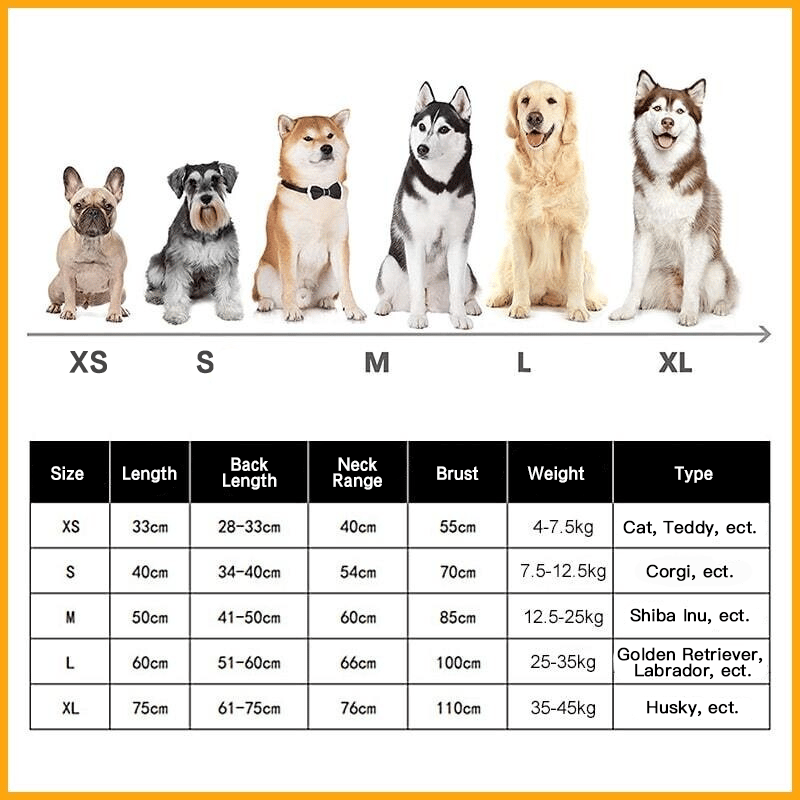 Finns i 7 storlekar från XS till 3XL och passar små, medelstora och stora hundar och katter. Det runda bröstet och halsen är justerbara för att bättre täcka djurets kropp.