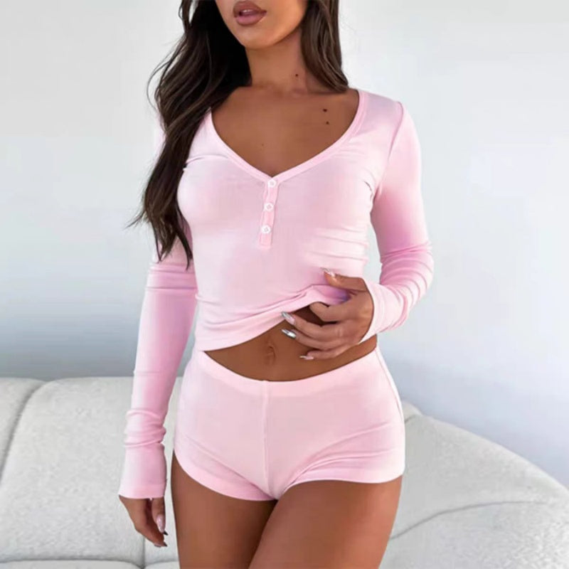 Paketet innehåller: 1 * Ribbad kort topp med knappar och shorts för kvinnor, 2-delat set